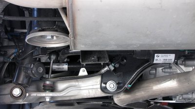 A kép jobb oldalán, a kipufogó felett az aktív keresztstabilizátor, baloldalon az állítható lengéscsillapító és légrugó