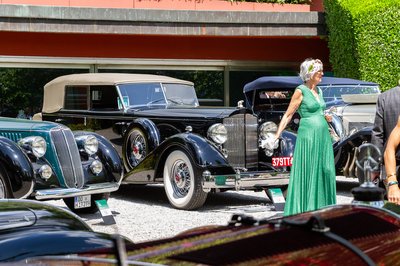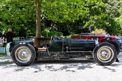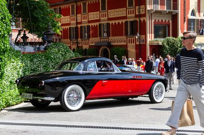 Bugatti Type 101, a háború utáni feltámadás nagy reménye jellegzetes 3,3 méter hosszú óriási tengelytávval, ilyen karosszériával ez az egyetlen készült,ez is megjelent a Comó-i tó partján