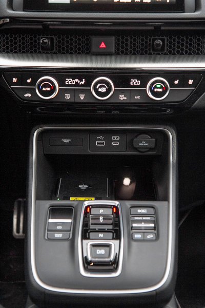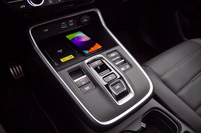 Az irányváltó kezelése szokást igényel, elöl pedig ott a vezeték nélküli töltőpad. Plusz a szokásos aljaztok: USB-A, USB-C és a 12V-os