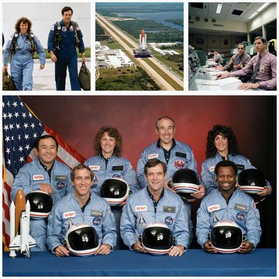 Bal felül Christa McAuliffe és Scobee. Középen a Challenger, útban a kilövőállásra. Jobb oldalt felül Covey, a csoportképen a Challenger legénysége