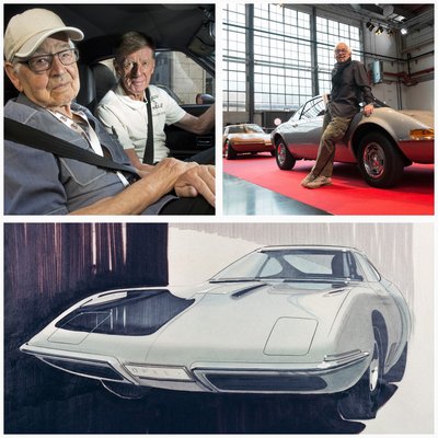 Walter Röhrlnek is van egy GT-je, mellette Erhard Schnell ül a bal felső képen. Schnell a jobb képen, alul pedig egy korabeli skicce a kocsiról – élete végéig imádott rajzolni s festeni