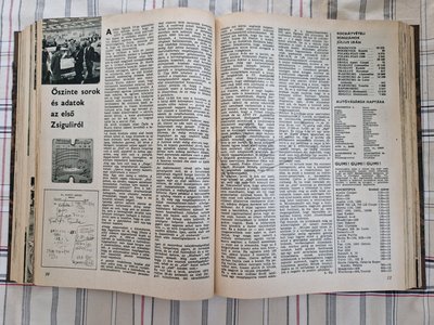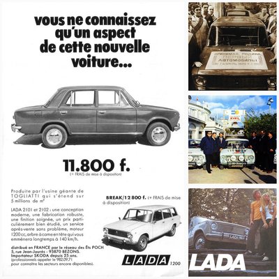 Bal oldalt egy francia hirdetés 1972-ből, jobb felül 1970. április 19-e, az első Zsiguli elkészülte, alatta verseny Ladák a Tour d'Europe 71 ralin, amin kategóriájukban az 1, a 3-ik és 4-ik helyet szerezték meg