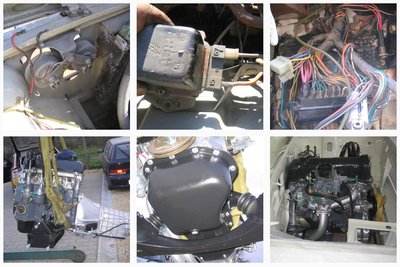 Felül a kiindulási állapotok, alul a készek. A motor-váltó együtt került a helyére 15 perc alatt