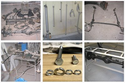 A futómű restaurálás lépései. Alul középen a Fiat csavarok és az orosz alátétek