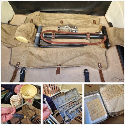 Kiterítve a szerszámkészlet, összecsavarva a hátfalra szerelhető a készlet. Bal oldalt a szerelőlámpa, középen a kis reszelő, jobbon az elsősegély doboz