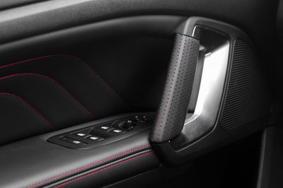 Perforált bőr az ajtóbehúzón is, meg pirossal varrott kárpit