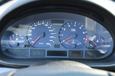 300 km/h-ig skálázott az Alpina-féle kék hátlapos műszerfal sebességmérője
