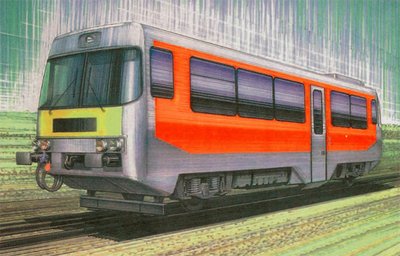 8. Szentpéteri Tibor formatervező látványterve az egyrészes, mellékvonali Ikarus motorvonatról. Ebből sem és a 300-as Ikarus karosszériáját használó változatból sem lett semmi (fotó: Ganz archív)