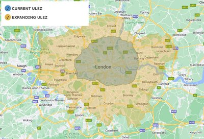 A londoni ULEZ zóna jelenlegi, és tervezett mérete.