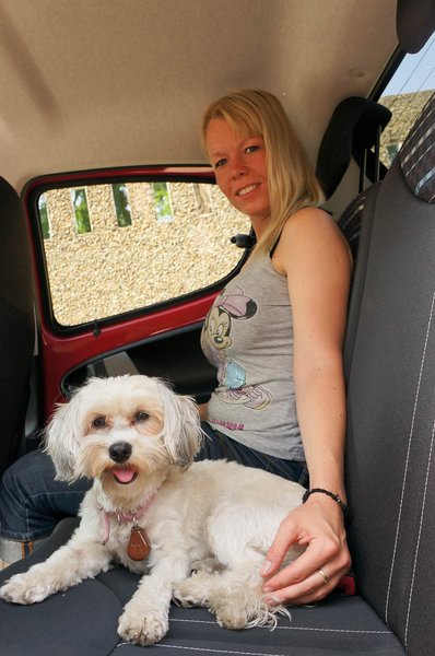 Szőke csajszinak aranyos kisautó és cuki kiskutya