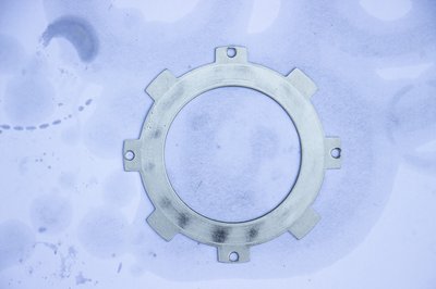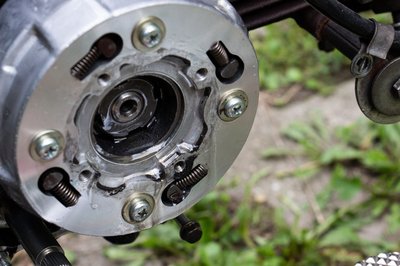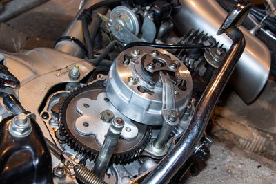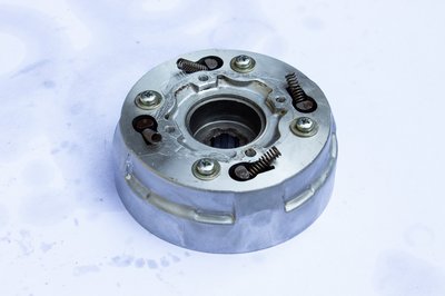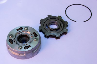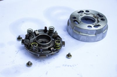 Biztos, ami biztos, kivettem a kuplungharangból a röpsúlyokat tartó egységet is. Valójában ez utóbbi van rácsavarozva a főtengelyre, de lényegében közvetlen kapcsolatban áll a kuplungharanggal