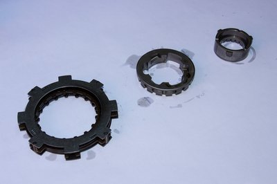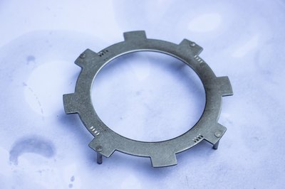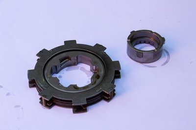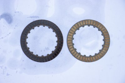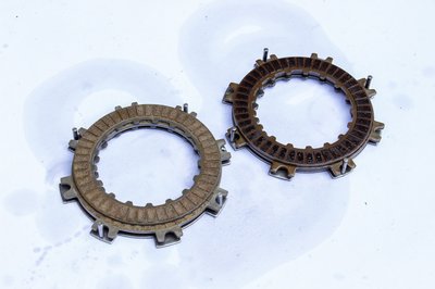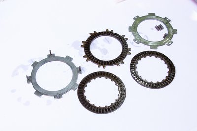 A középen lévő külső fogazású betétes lamellának mindkét oldalára ragasztottak súrlódóbetétet. A két belső fogazású lamellának csak az egyik oldala ilyen. A két szélső, külső fogazású zárólamellán egyáltalán nincs betét