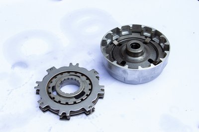 A Seeger gyűrű beillesztése után újra egyben! Újra jöhetett a forgatási próba. Abban az irányban, ahogy a motor hajt ugyanúgy, mint korábban elforgott egymáshoz képest a harang és a kis fogaskerék, a másik irányban viszont azonnal összeakadt. Így a jó!