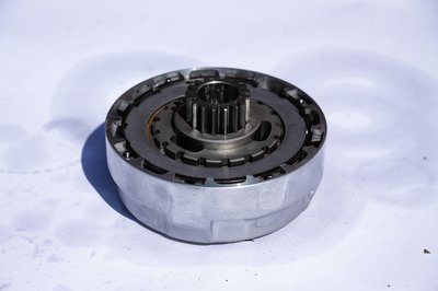 Íme a komplett kuplung, beleillesztve a váltó felé hajtó fogaskerékkel. A főtengely lényegében a kuplungházat hajtja. Ha úgy forgattam a kuplungházat a fogaskerékhez képest, ahogy a motor, akkor szabadon forogtak. Ha fordítva, akkor másfél fordulat után ö