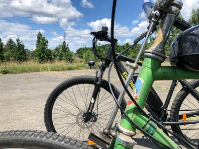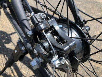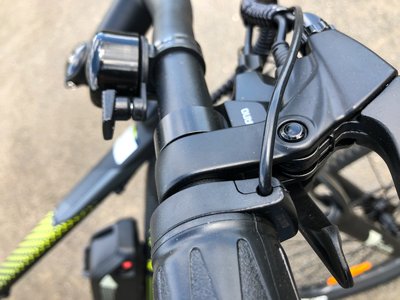 Elöl-hátul tárcsafék, de a féknyergek nem hidraulikusak. Kolos cimborám szerint egy elektromos bringára illene olajos rendszert szerelni, de én még nem éreztem a megoldás gyengeségét, mindenhol megállt