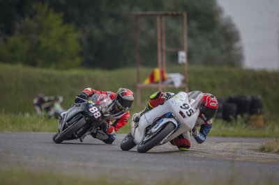 A Moto 4T kategóriában kemény csaták mentek. Ez egy vegyes kategória változatos motorokkal - köbcentiben 250 a felső határ, életkorban a 15 év. A képen Czepó Donát (88-as rajtszám, Moriwaki motor) és Kovács Zolika (95, IMR) üldözik egymást