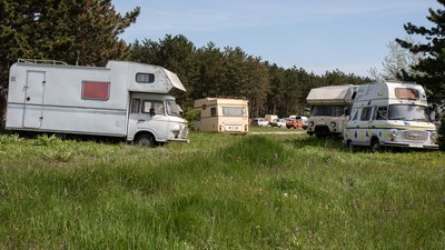 Na, a kemping falu! Ettől teljesen kész voltam. A Barkas lakóautó csak a kezdet, hisz ott a többi is. Micsoda tisztás, micsoda hangulat! Elő a májkrémet, meg mást is, mert itt nappal is buli van.