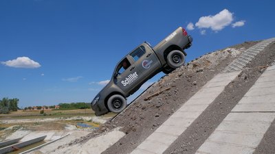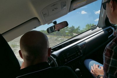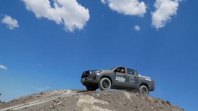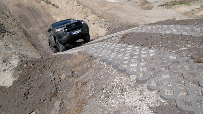 Ez még az a meredekség, ahol még fel tudtunk menni: 30 fok. A 40 fokos meredélyen már képtelenség. Ezt ki is kell próbálni, mielőtt autóval nekifutunk. Esetünkben ez egy pickup, itt már a SUV kevés