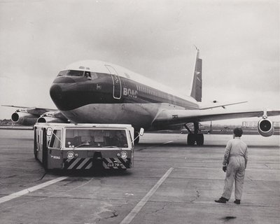 A Hunslet ATT 77-es reptéri vontató a BOAC egyik Boeing 707-ese előtt