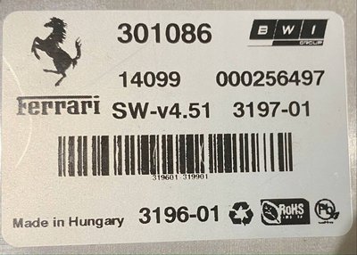 A 458 Speciale aerodinamikát vezérlő egységének címkéje. Eszerint a vezérlő magyar gyártmány