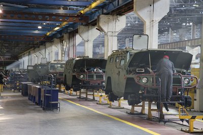 A GAZ gyár Tigr M gyártósora. Ezeknek a katonai járműveknek a motortere tele, eredetileg van Bosch alkatrészekkel, ezért jelenleg nem is gyártják őket, pedig a nagy veszteségek miatt ezek is kellenének a frontra