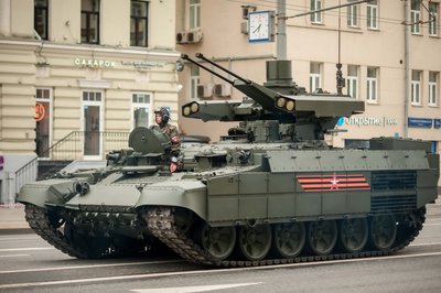 Mire nem jó egy jó alváz: a T72 páncéltestére szerelték rá a mindent (is) elpusztító tornyot, rakétákkal, géppuskákkal. Támogatja a gyalogságot a Terminator fantázianevű pusztítógép, itt épp díszeleg a szemlén