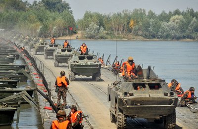 Csepel D 944 PSZH-k haladnak át a Dunán létesített ponton-hídon Ercsi mellett