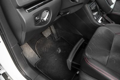 A szőnyeg kikopott a pedáloknál - ennek pont ez a funkciója, védi alatta a gyárit. Az első ülések alatt bélelt fiók lapul