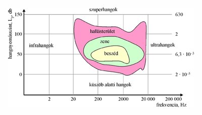 A piros területet felülőről a fájdalom küszöb, alulról a hallás küszöb határolja