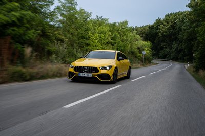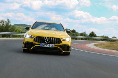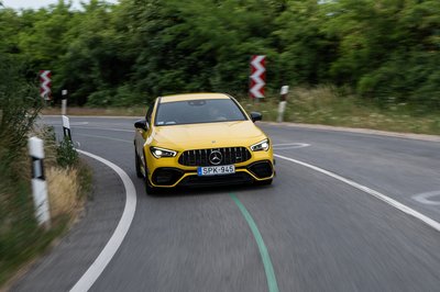 A vezető úgy érzi, minden hátul történik, de kellemesen irányítható marad csúszás közben is az AMG 45 S, tehát bizonyára segít az első tengely