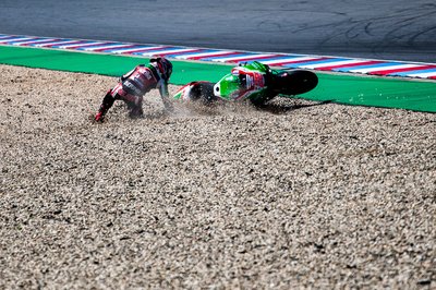 Pol Espargaro a kép elkészítése előtt és után olyan dührohamot kapott, hogy három méteres távolságból mertük csak figyelni az eseményeket. Egyébként szépen motorozott a KTM-mel, és viszonylag kiegyensúlyozott teljesítményt mutatott