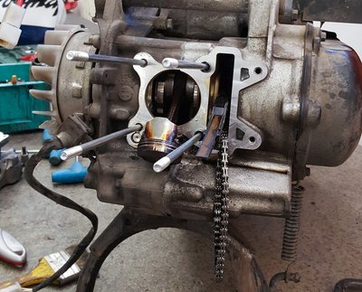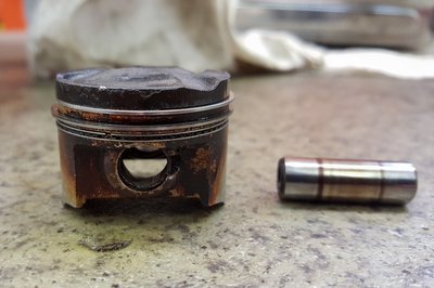 Képen nincs meg, milyen apró, de ez a dugattyú kisebb, mint a Simsoné, ez ugyanis egy hosszú löketű motor, nem is kimondottan pörgős. Hogy legyen némi teljesítménye, rámentek a kompresszióra, jól látszik, hogy ott van a két szívó- és az egy kipufogószelep