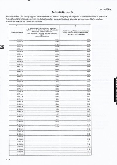 Ez a táblázat mutatja, hogy ha nem forintosítanak (bal oldal), akkor a végén eszetlen magas törlesztőket kellett volna kifizetni, viszont így, hogy fixálták (jobb oldal), stabil törlesztők vannak viszont hosszabb futamidővel (a táblázatnak van folytatása)