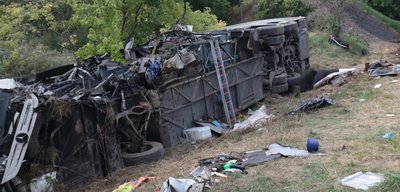 A Mercedes busz jobb oldala, a negyedik-ötödik üléssorig gyakorlatilag eltűnt. Hatalmas erőket kellett elvezetnie a busz karosszériájának. Ebből teljesen nyilvánvaló, hogy a jármű nagy sebességgel rohant neki a felüljáró pillérnek (fotó: Index)