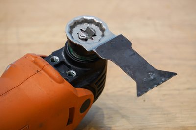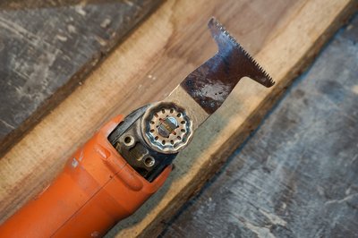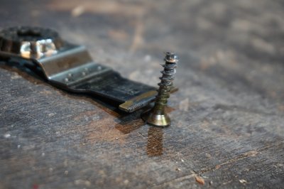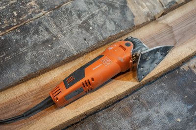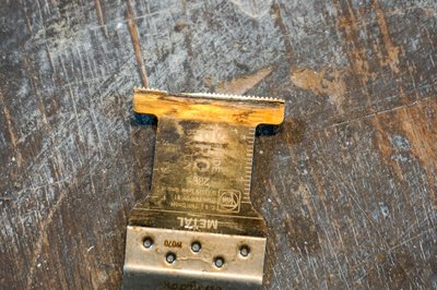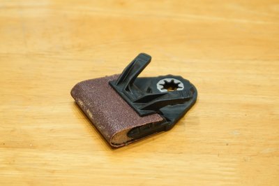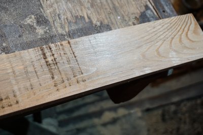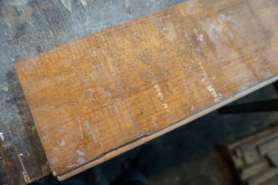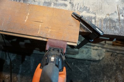 Ezen nem csak festék és lakk van, de még csomó rászáradt ragasztó is, de ennek ellenére gyorsan lecsiszolta
