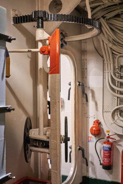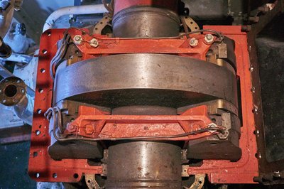 A négy hajócsavarhoz vezető tengelyek egyike, mely több réteg szigetelésen halad át, hogy ne törjön be tengervíz. És azok ott mintha fékbetétek lennének!