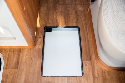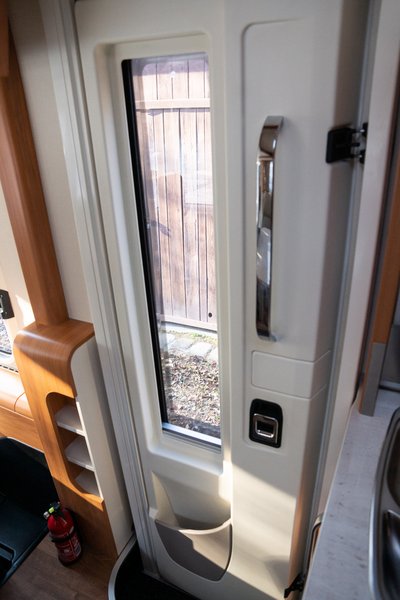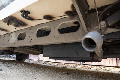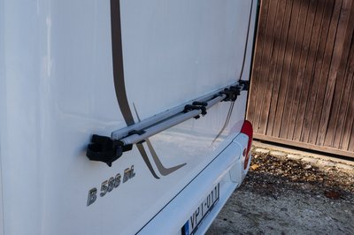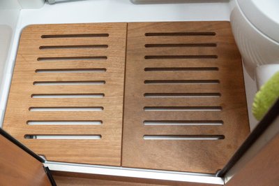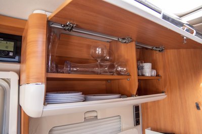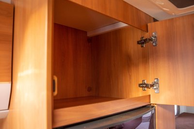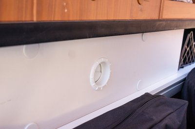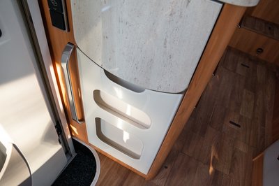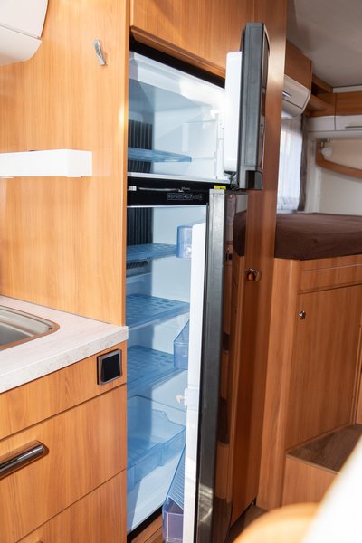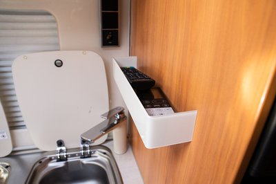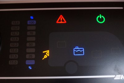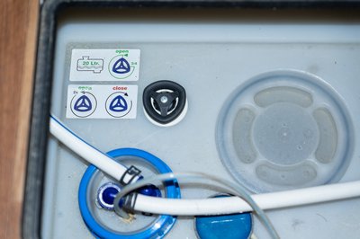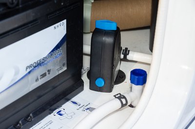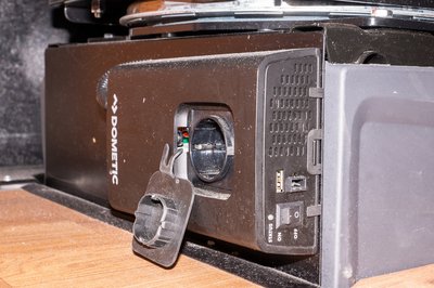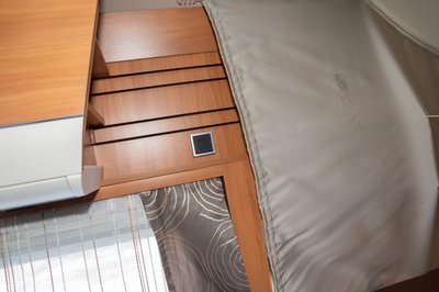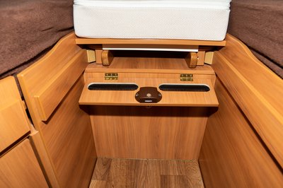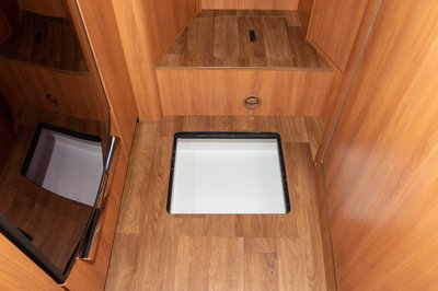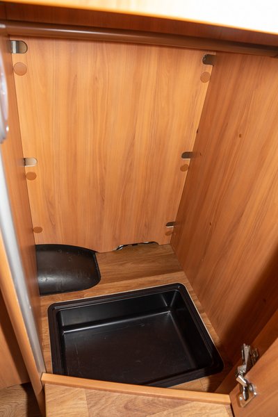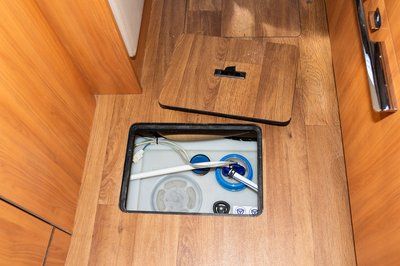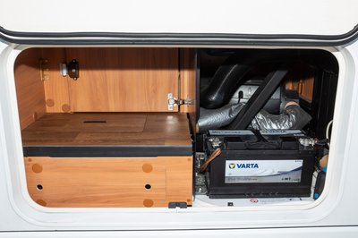 A munkaakku itt kívülről elérhető. Mögötte bújik meg a Truma Combi kazán, a bal oldal dobozban pedig az elektromos vezérlés egy része