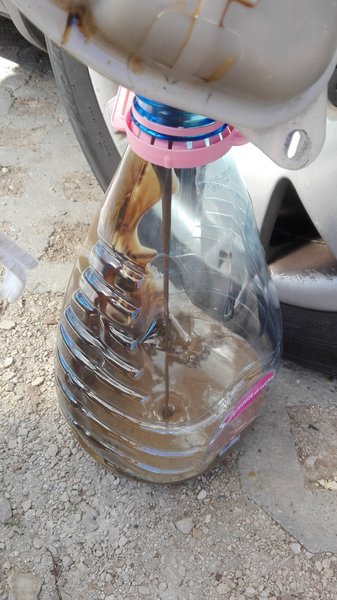 Ilyen volt a leeresztett olaj: sok pici buborékkal. Mindenki megnyugtatására a fáradtolajat beletöltöttem az üres olajosflakonokba és leadtam benzinkútnál a gyűjtőedénybe