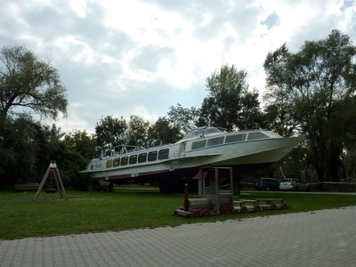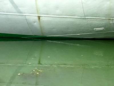 A hajó mellett a világos csíkok a vízen a felszínen napozó szélhajtóküszök