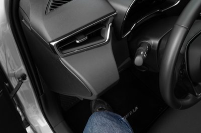 Innen nézve kicsit egymás hegyén-hátán vannak a dolgok, de a kormány jó szögben áll és a váltó is kéznél van. Már vagy 10-15 éve nem lehetett ennyire jól ülni kompakt Toyotában