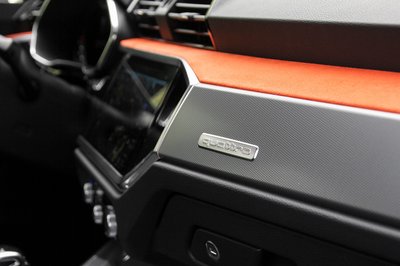 A műszerfalon és az oldalkárpitokon is feltűnhet némi színes Alcantara. Váratlan, de nem példa nélküli megoldás, hogy a sok műanyag közé valamilyen textilt csempésszenek, a műszerfalra. Az ápolás és tisztán tartás okozhat kihívásokat, de megéri, mert baro