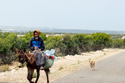 A marokkói utak szentháromsága: autósokra mosolygó fekete szamárháton, nyomában kutyával