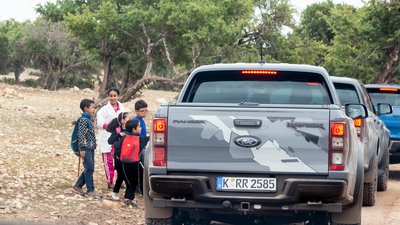 Nagyon Afrika: gyerekek csodálkoznak rá az új pickupokra. A háttérben zöldellnek az argánfák