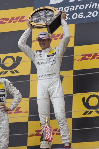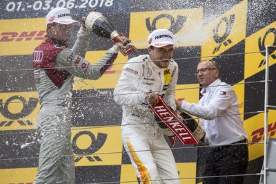 Auer már a kocsiból is majd kirobbant örömében, hát még amit a pódiumon kapott Mülleréktől! Klassz, hogy önfeledten lehet ünnepelni, hiszen ezután a DTM mai programja véget ért, nyugodtan lehet locsolni és vedelni a pezsgőt