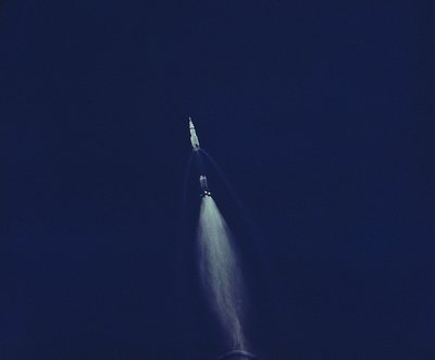 Az indítóállásról fotózva. Innen látszik jól a LES biztonsági rendszer a rakéta hegyén, valamint alatta a parancsnoki modul, a legénység utazott