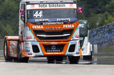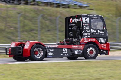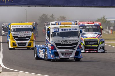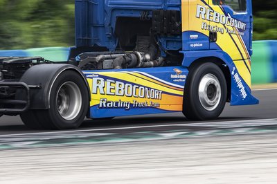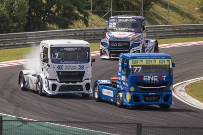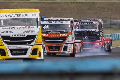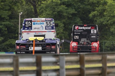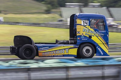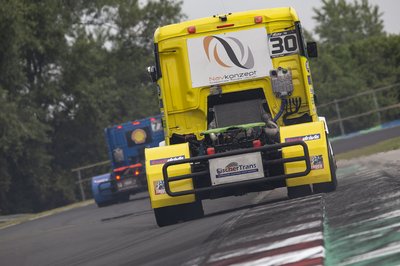Adam Lacko, a cseh vitéz üldözi csőrös Freightlinerével Norbit a Mansell kanyar után az időmérőn. Lackonak nem ez lesz a kedvenc napja, az első versenyen konkrétan kizárták, miután háromszor is sikerült túllépnie a megengedett 160 km/h-s sebességet