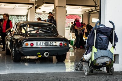 1963-as Lotus Elan a boxban, és egy hozzávetőleg 2015-ös fiatal autórajongó első járműve a box előtt.