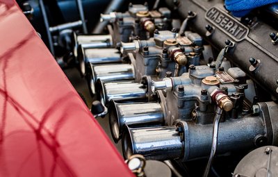 Fenséges fémek a Maserati 300S motorházteteje alatt. A 62 éves hathengerest egy sátorban finomhangolták, mielőtt a pályára vitték, hogy jól meghajtsák. A szerelők pedig, mintha ott se lettünk volna, nyakig olajosan feküdtek az öreg Maser alatt, hogy időbe