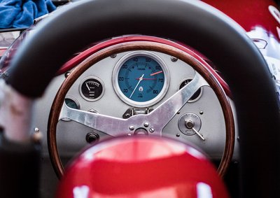 Célszerű 1955-ös cockpit, a Maserati 300S-é. Ilyen és ehhez hasonló belsőkben küzdöttek a múlt gladiátorai, az ergonómia és a túlszabályozás kora előtt. Vérre menő küzdelem itt már nem volt kilátásban, de a feeling maradt a régi.