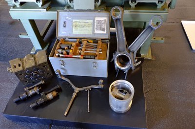 Ha minden igaz, akkor ez az 1949-es MD650 dízelmotor hengerfeje, adagolószerelő szerszámkészlete, hajtórúdjai (V-ben összekapcsolva!), de az a dugattyú túl pici, talán a kompresszoré lehet? Nem volt felirat mellé